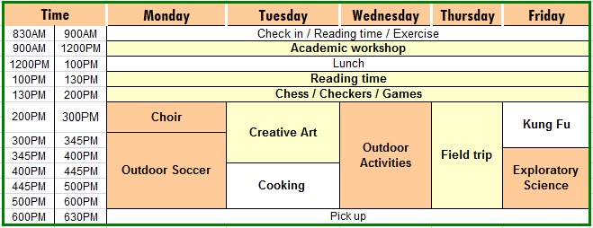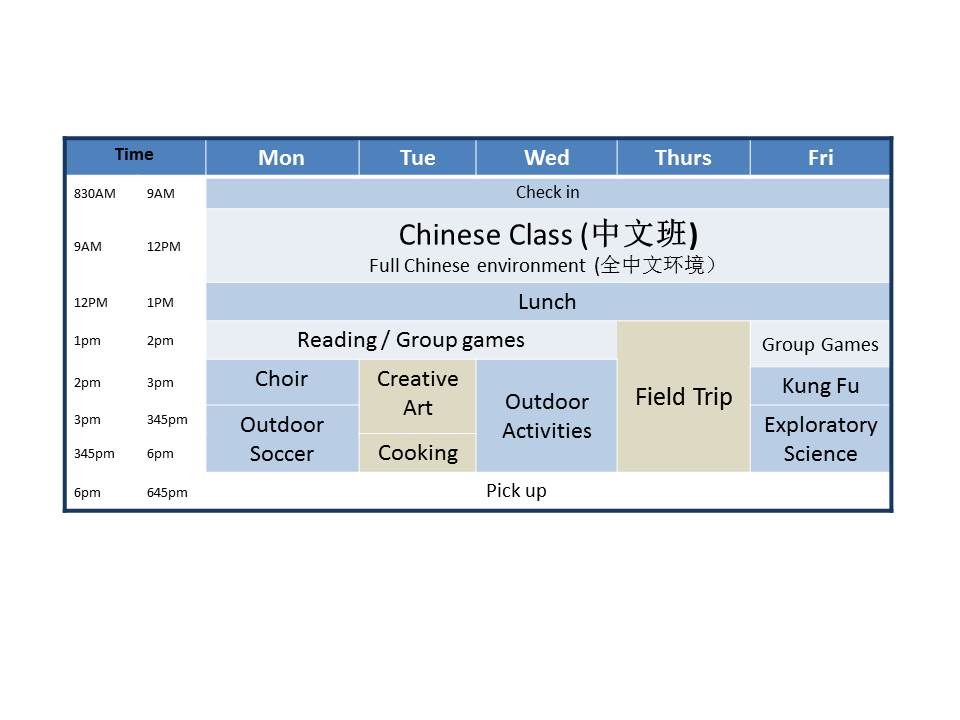 A 3-hour session of Chinese workshop in the morning, plus a recreational program in the afternoon, provides a full-day of balanced activities. What a way to spend the summer!